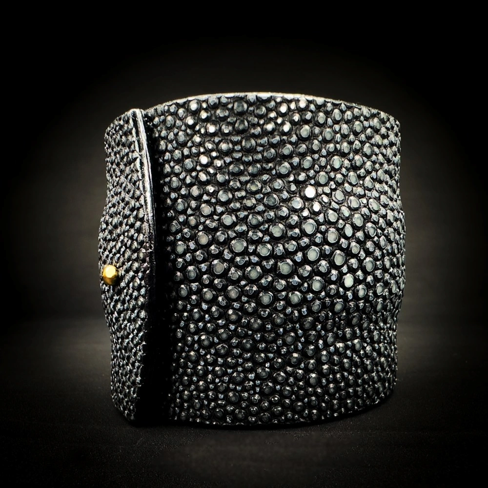 La manchette est réalisée en galuchat noir poncé, sélectionné pour la richesse de sa texture et sa capacité à capter la lumière.