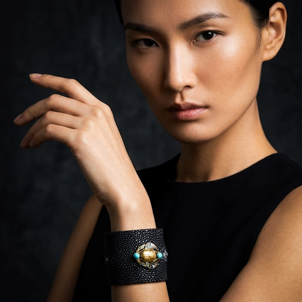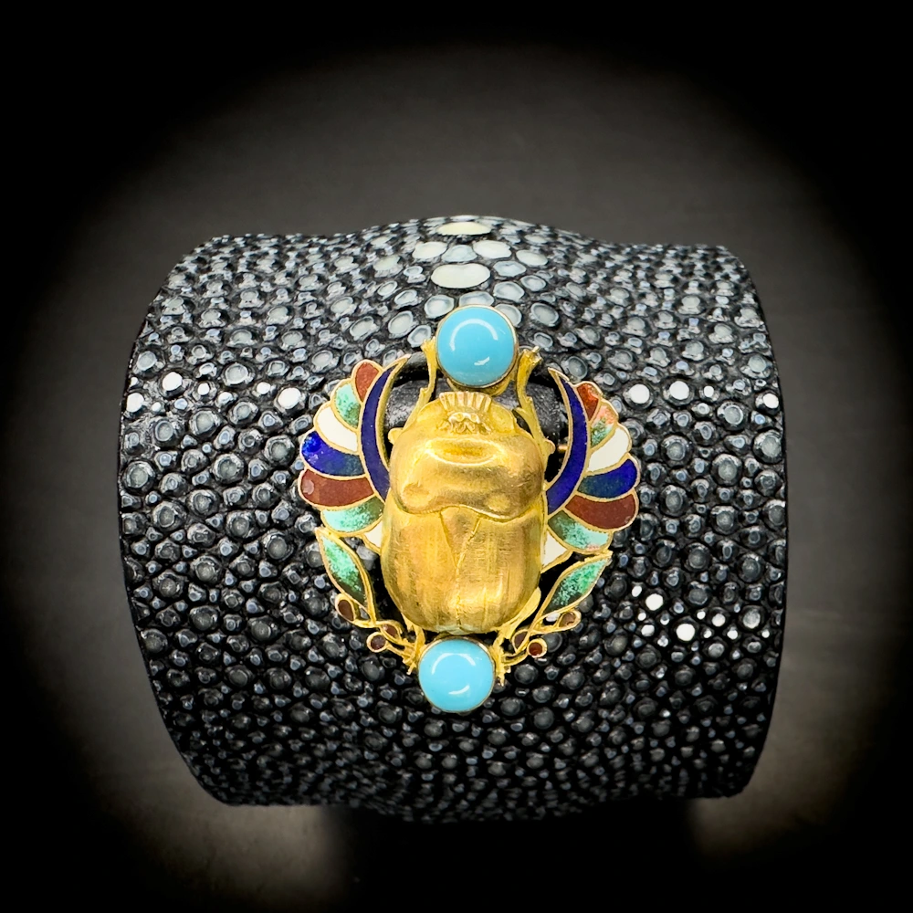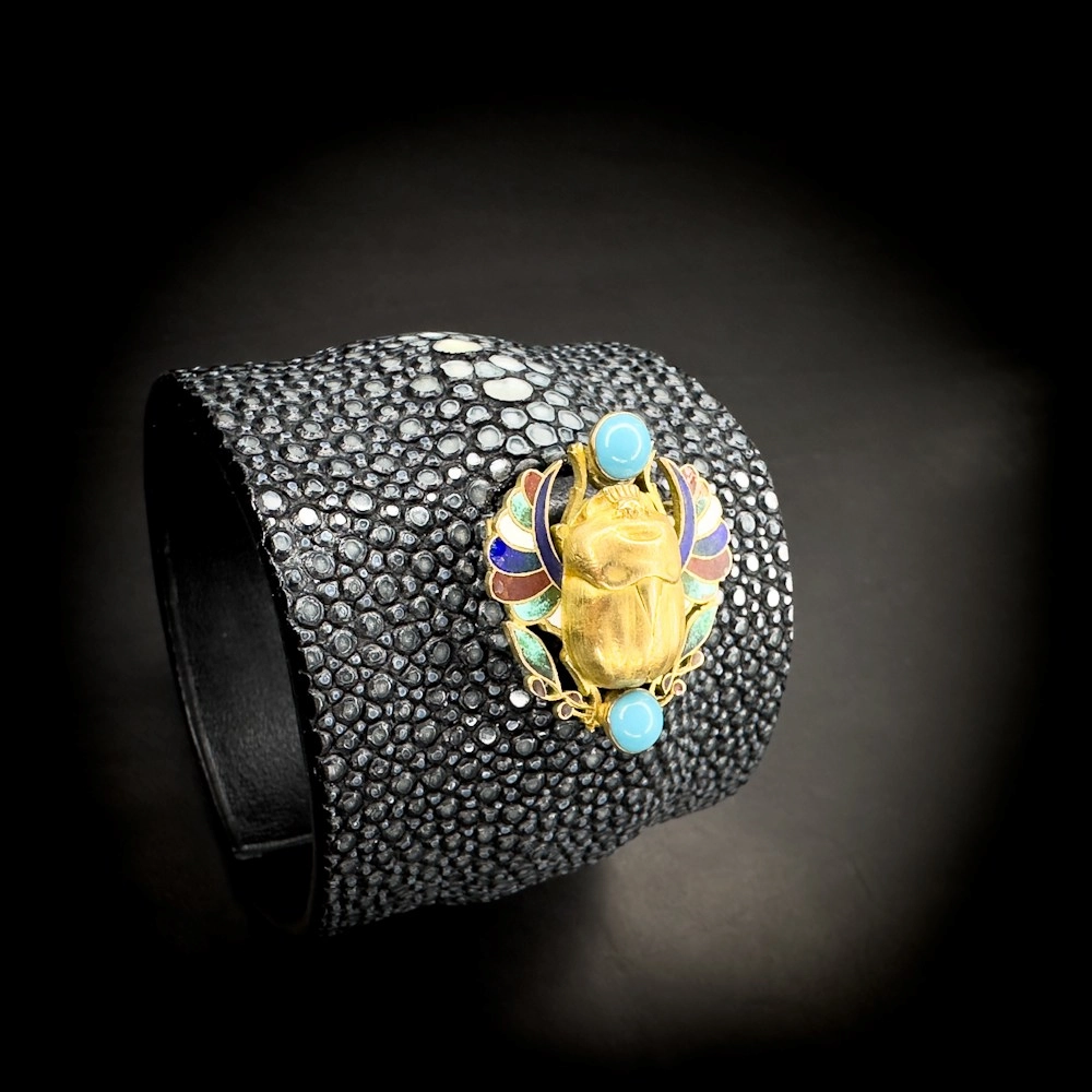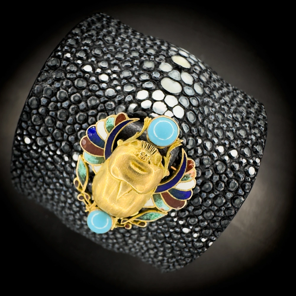 Ce bracelet manchette cuir femme est façonné dans un galuchat noir poncé, dont la surface minérale capte la lumière avec subtilité, révélant une matière rare, presque joaillière. Il est sublimé d’une broche ancienne à motif de scarabée, attribuée à la maison Piel Frères, en laiton doré, émaux polychromes et cabochons turquoise, dont la présence graphique dialogue avec la texture du cuir.