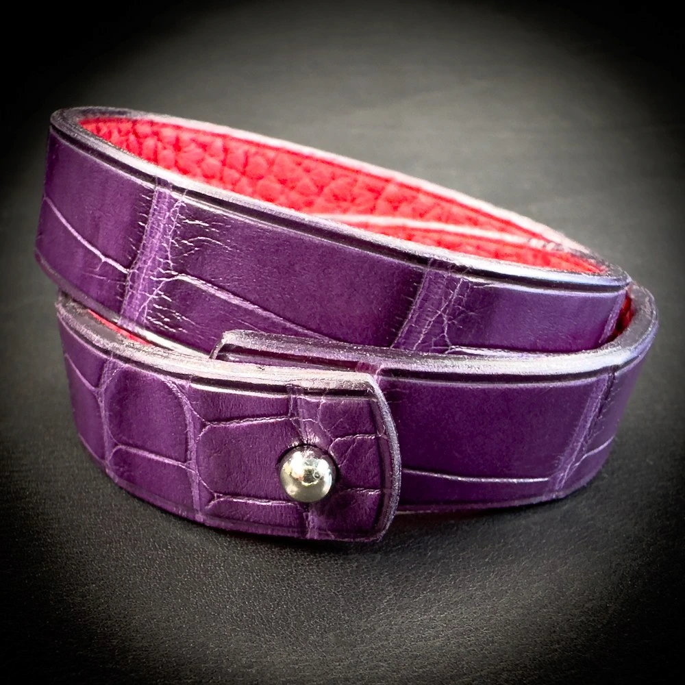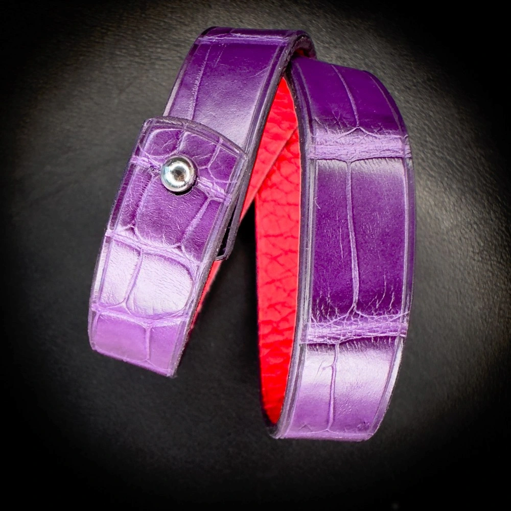 Ce bracelet double tour en alligator mat violet améthyste séduit par la profondeur de sa teinte et la noblesse de son cuir.