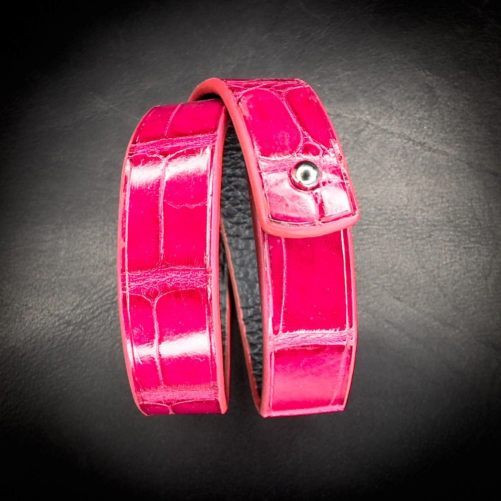 Ce bracelet double tour en alligator rose brillant capte immédiatement le regard par l’intensité de sa couleur et l’éclat naturel de son cuir.