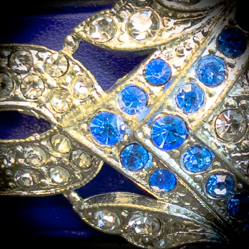 - Boucle : Boucle ancienne géométrique Art Déco, circa 1925 – argentée, sertie de strass blancs et bleus