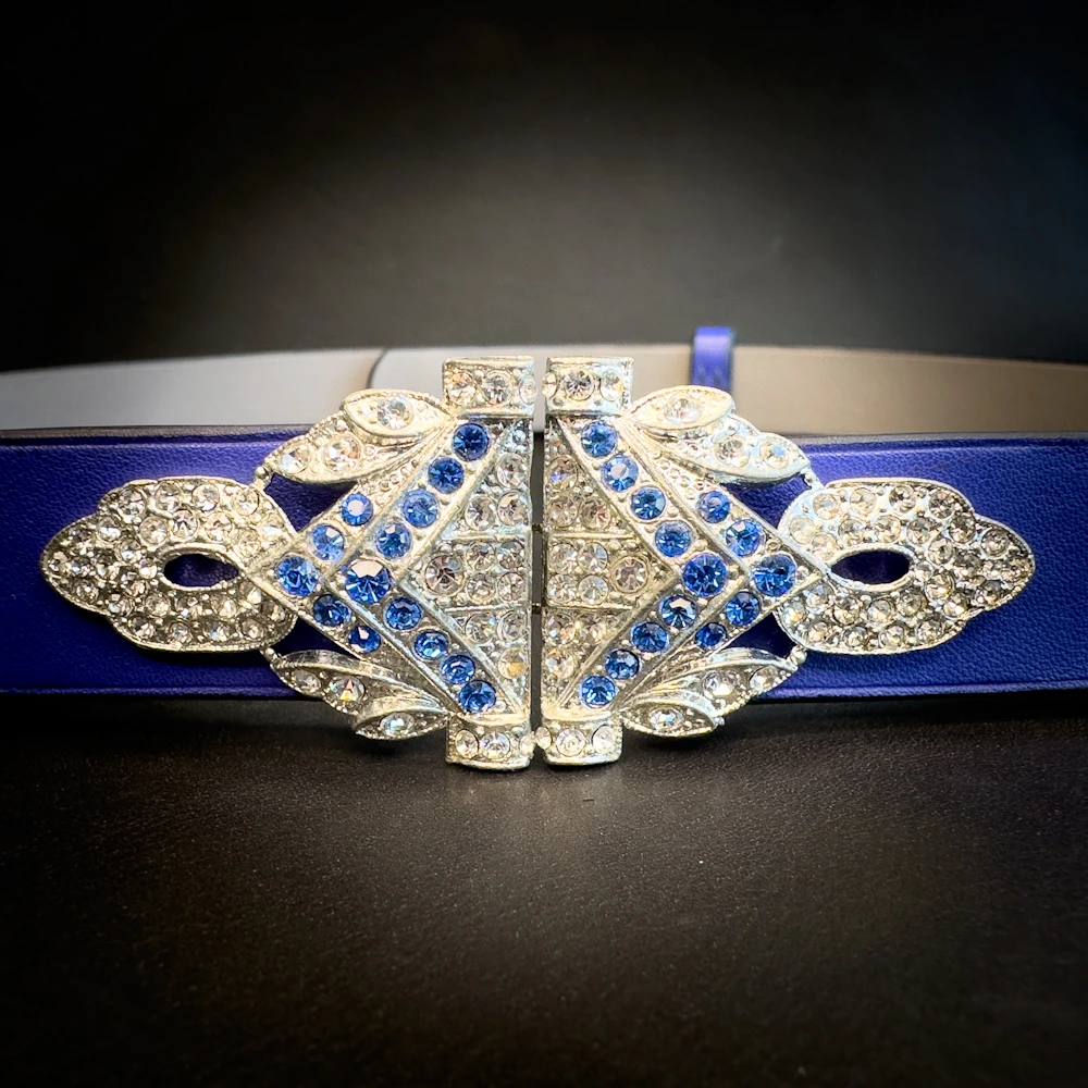 Elle associe un cuir de veau lisse bleu électrique à une boucle ancienne et précieuse. Celle-ci est entièrement sertie de strass : des cristaux blancs éclatants bordés d’une double flèche de strass bleu profond montés en motifs géométriques.