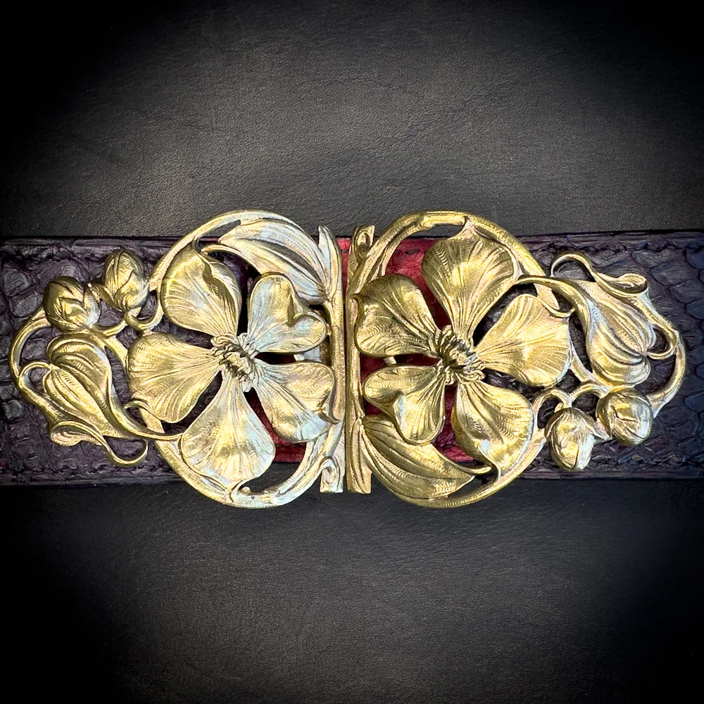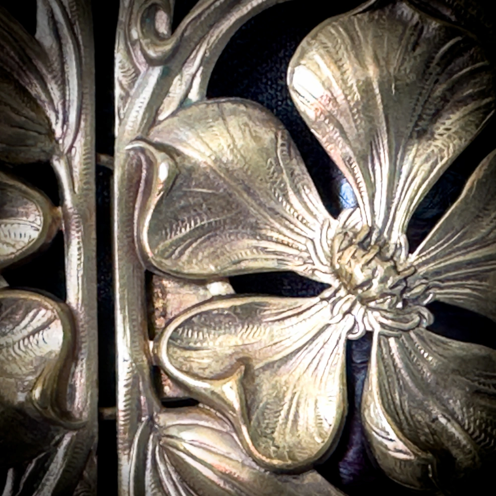 - Boucle : Boucle florale ancienne – Art Nouveau, circa 1900 – laiton doré – motif fleurs et feuillage stylisés