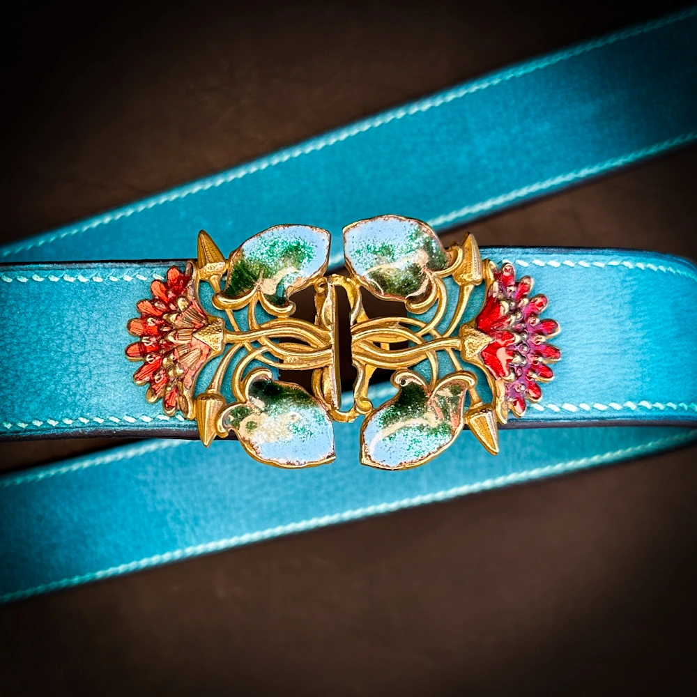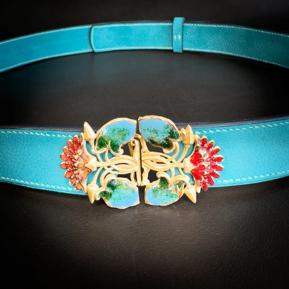 - Boucle : Boucle Art Nouveau circa 1920, en laiton doré émaillé – fleurs stylisées de papyrus rouges, feuillages vert d’eau et bleu ciel