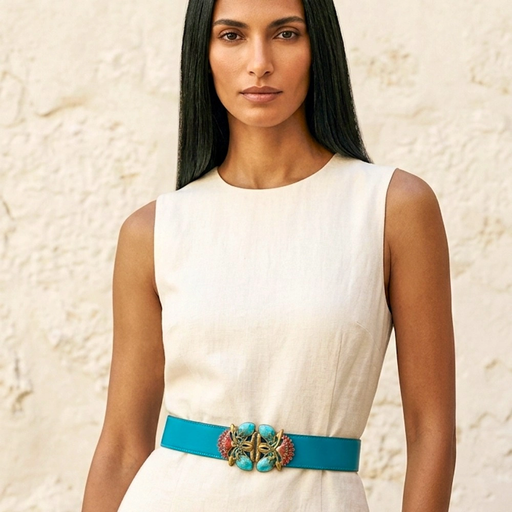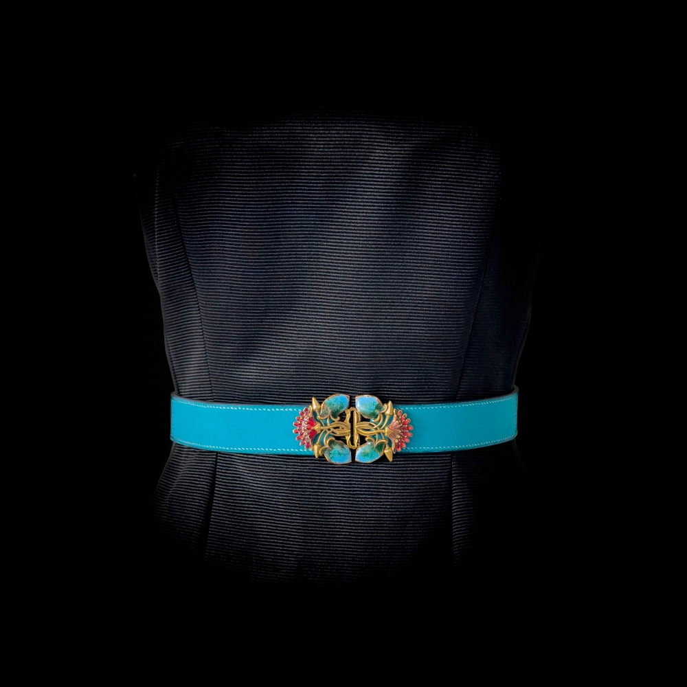 Réalisée à la main dans un cuir turquoise lumineux, elle dévoile une somptueuse boucle ancienne en laiton, ornée de fleurs de papyrus rouges, émaillée à la main.